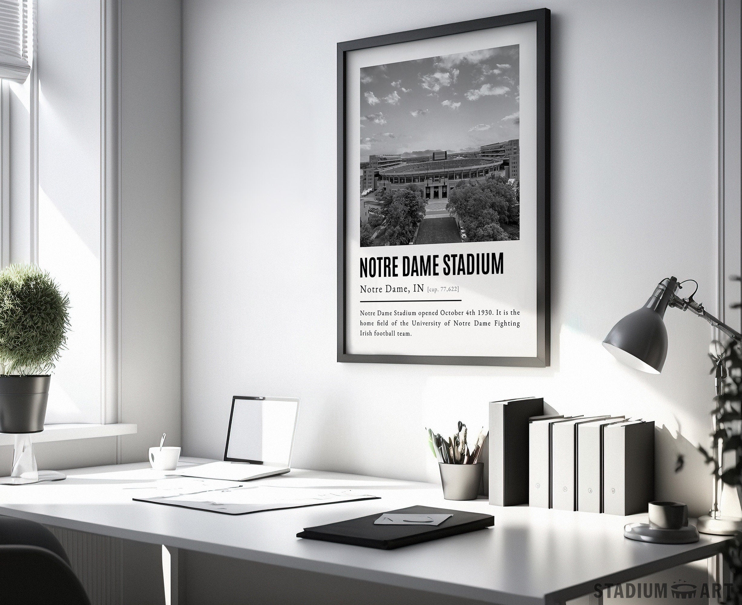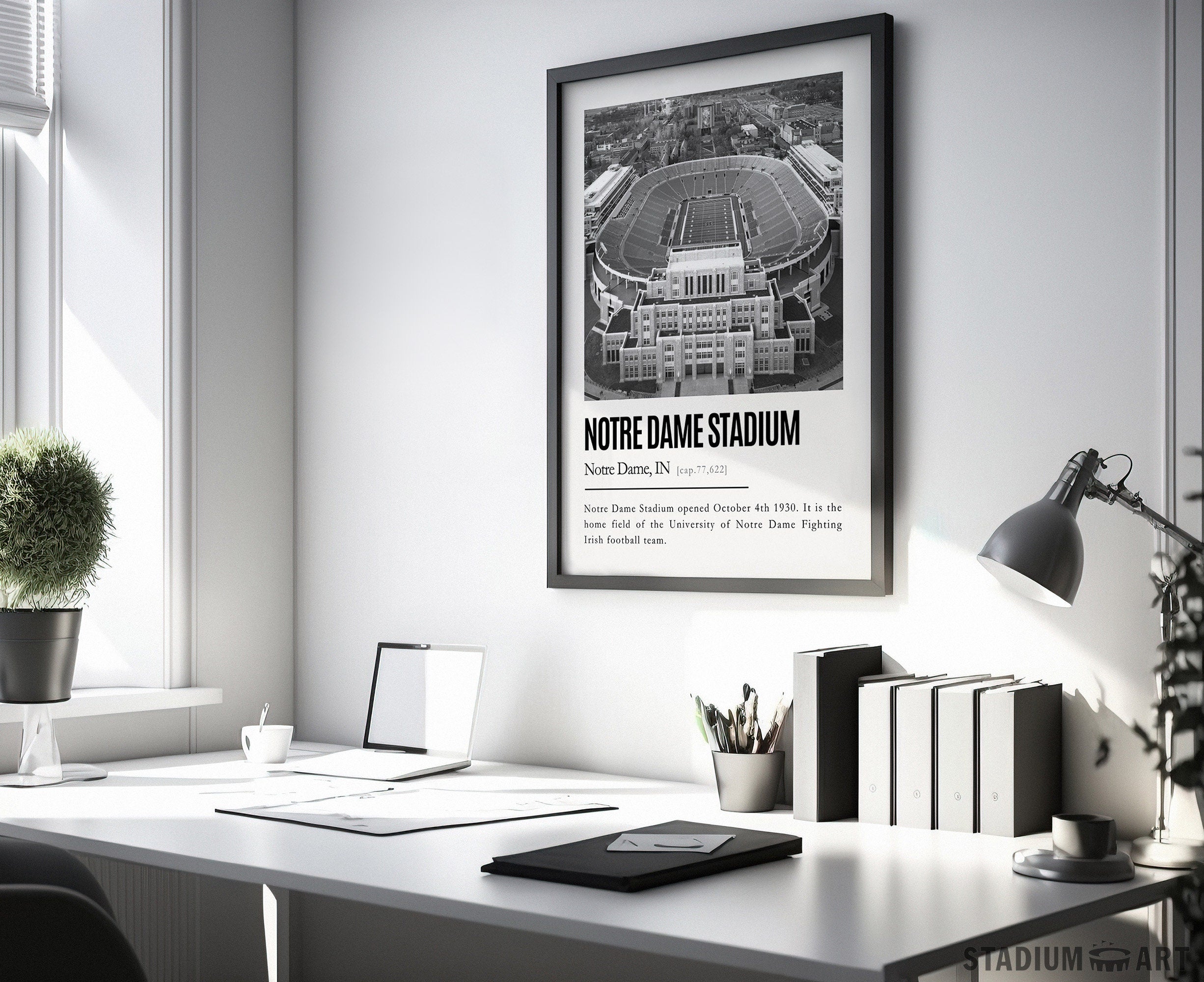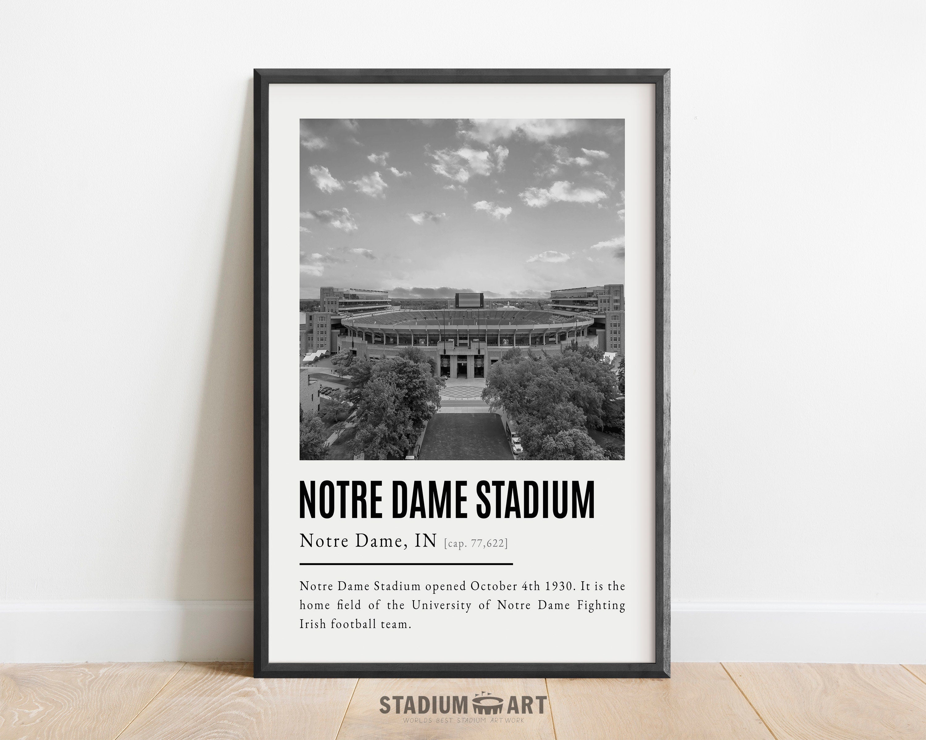Notre Dame Stadium Print, Notre Dame Fighting Irish Poster/Canvas, Aerial View, B&W Modern Football Wall Art Decor, Game Day Keepsake