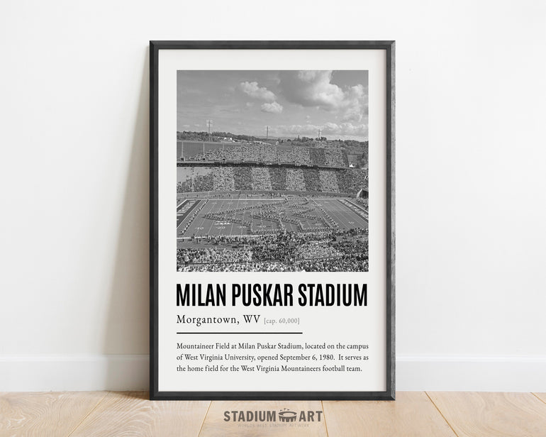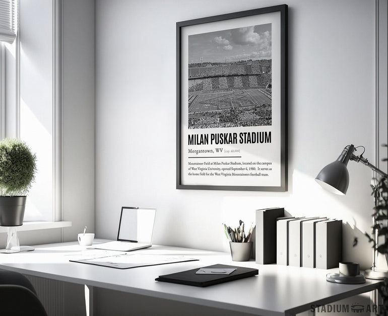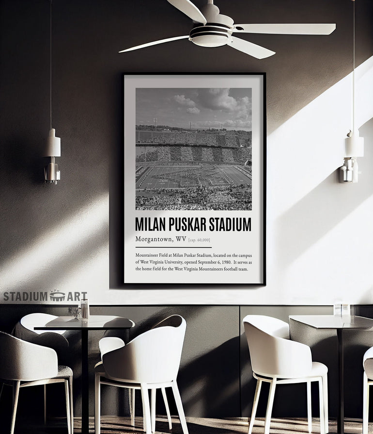 Milan Puskar Stadium Print, Virginia Mountaineers Poster/Canvas, Seat View, B&W Modern Football Wall Art Decor, Game Day Keepsake