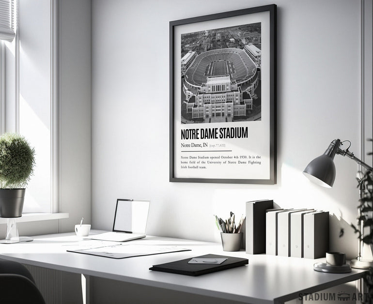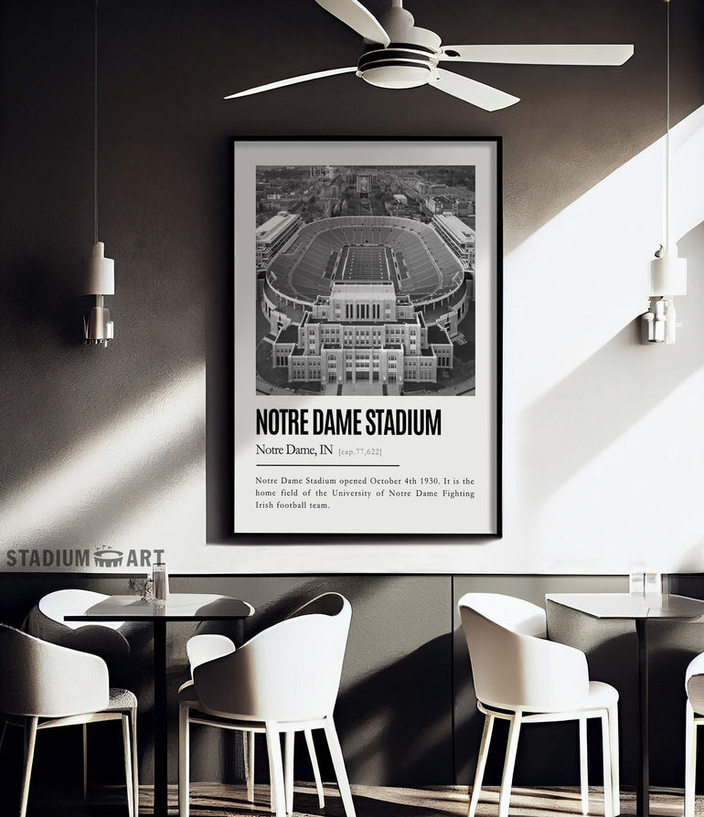 Notre Dame Stadium Print, Notre Dame Fighting Irish Poster/Canvas, Aerial View, B&W Modern Football Wall Art Decor, Game Day Keepsake