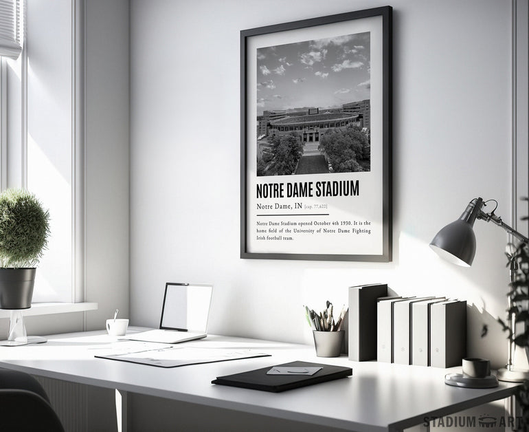 Notre Dame Stadium Print, Notre Dame Fighting Irish Poster/Canvas, Aerial View (v2), B&W Modern Football Wall Art Decor, Game Day Keepsake
