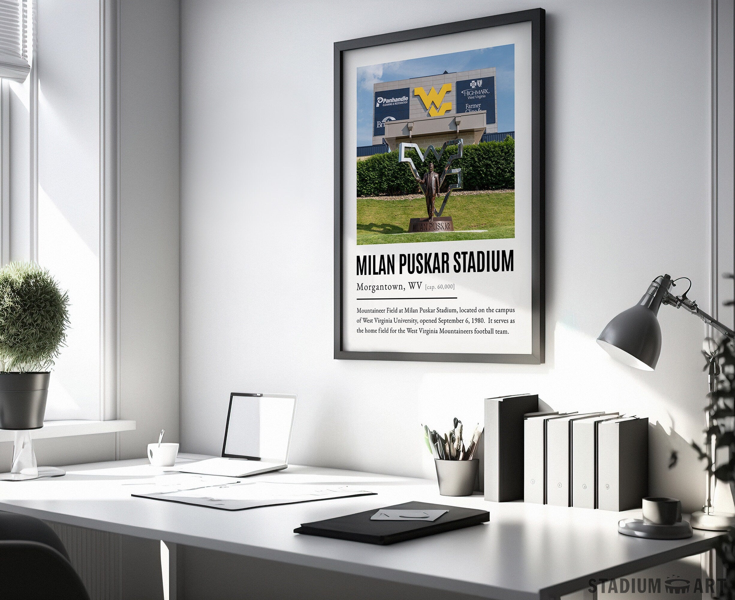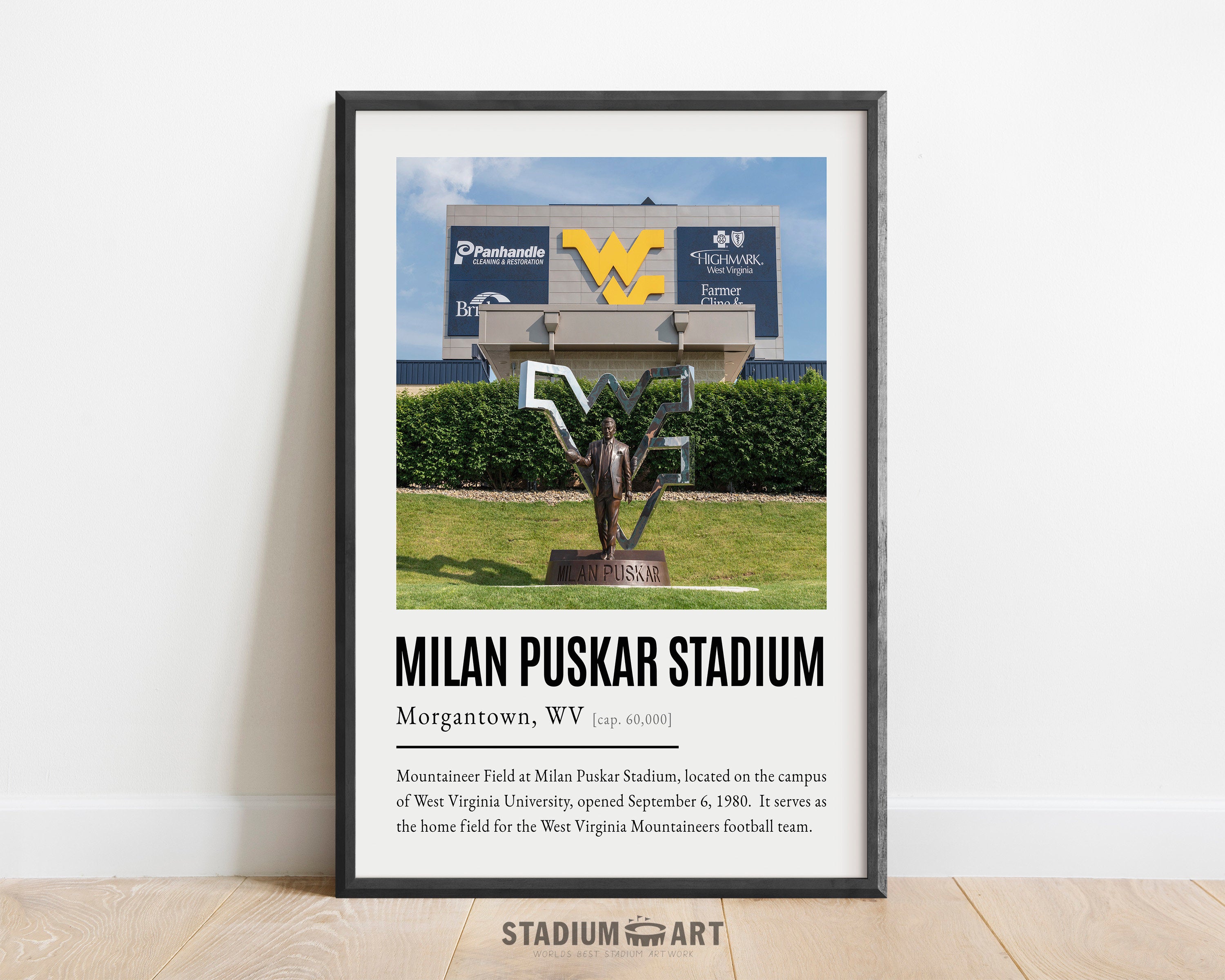 Milan Puskar Stadium Print, Virginia Mountaineers Poster/Canvas, Street View, Modern Football Wall Art Decor, Game Day Keepsake
